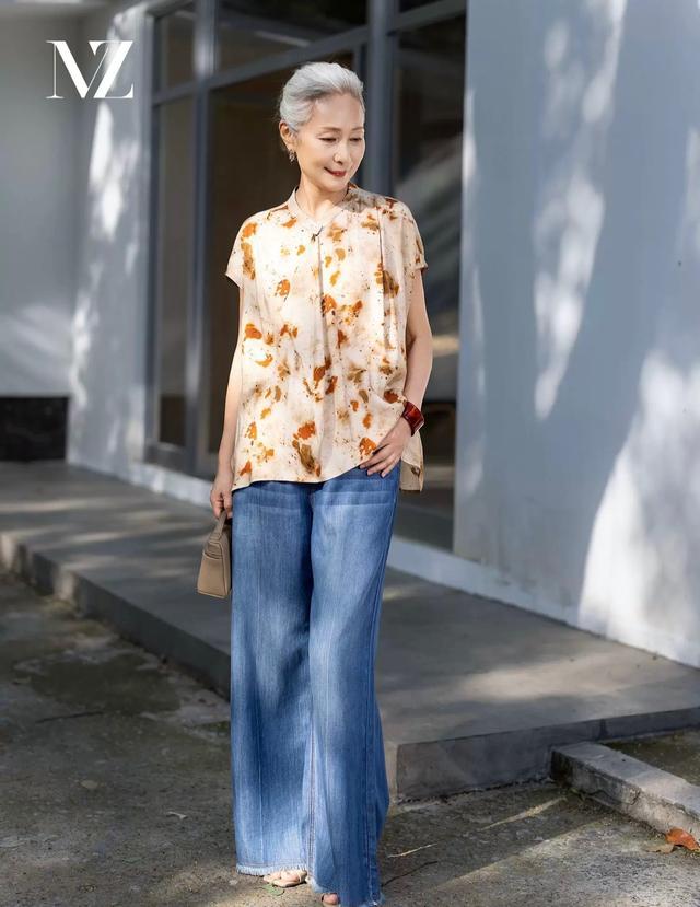 印花衬衫配牛仔阔腿裤,纵向线条拉长身形比例,显高效果一绝。