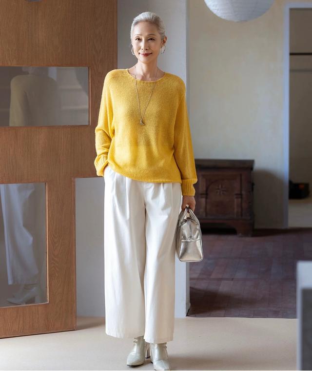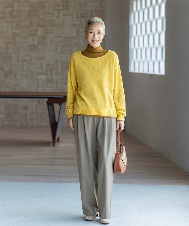 黄色充满着生命力,覆盖在罩衫上,叠穿棕色高领打底衫,显白抬气色,即便是一头白发,也不想老态。