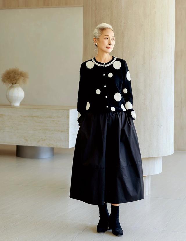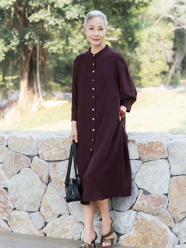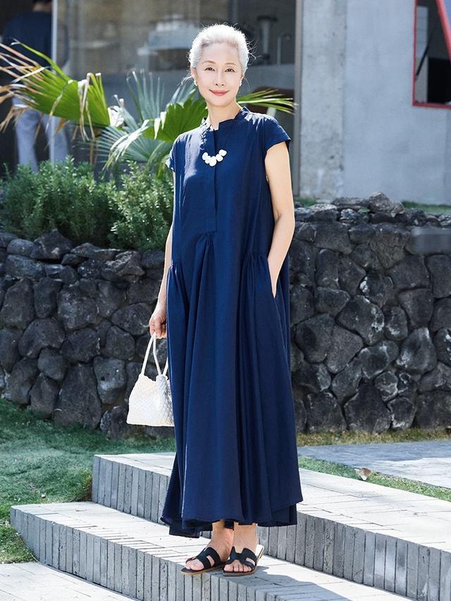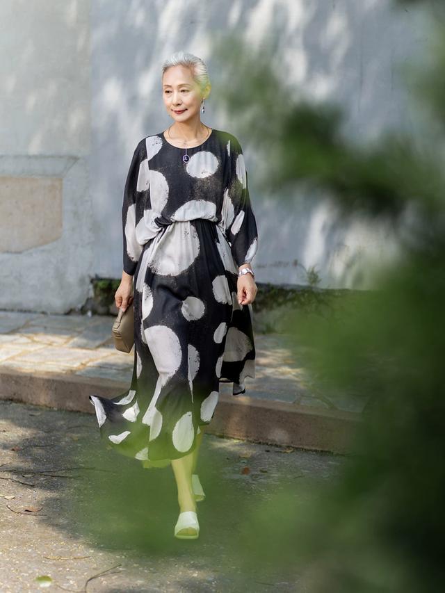 上了年纪又如何?与其穿老年装,不如换上禅意长裙,裙摆垂感十足,黑色简约干净,踩双拖鞋也好美。