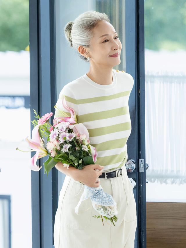 奶油绿条纹衫,清新又减龄,搭配白色牛仔直筒裤,显年轻10岁不止。